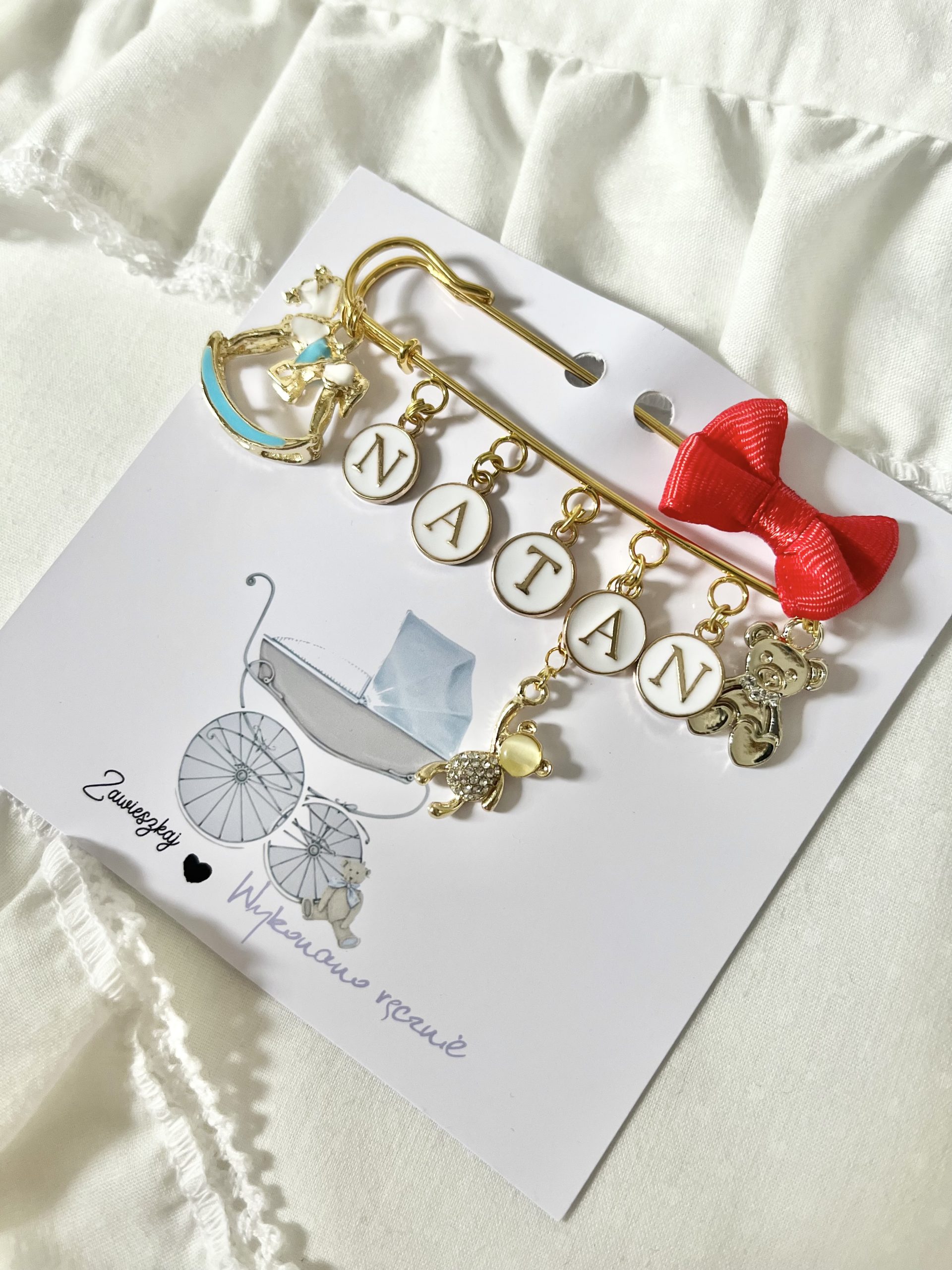 Agrafka w kolorze złotym to idealny prezent na Baby Shower lub po prostu kiedy wybierasz się w odwiedziny do nowo narodzonego dzieciątka.