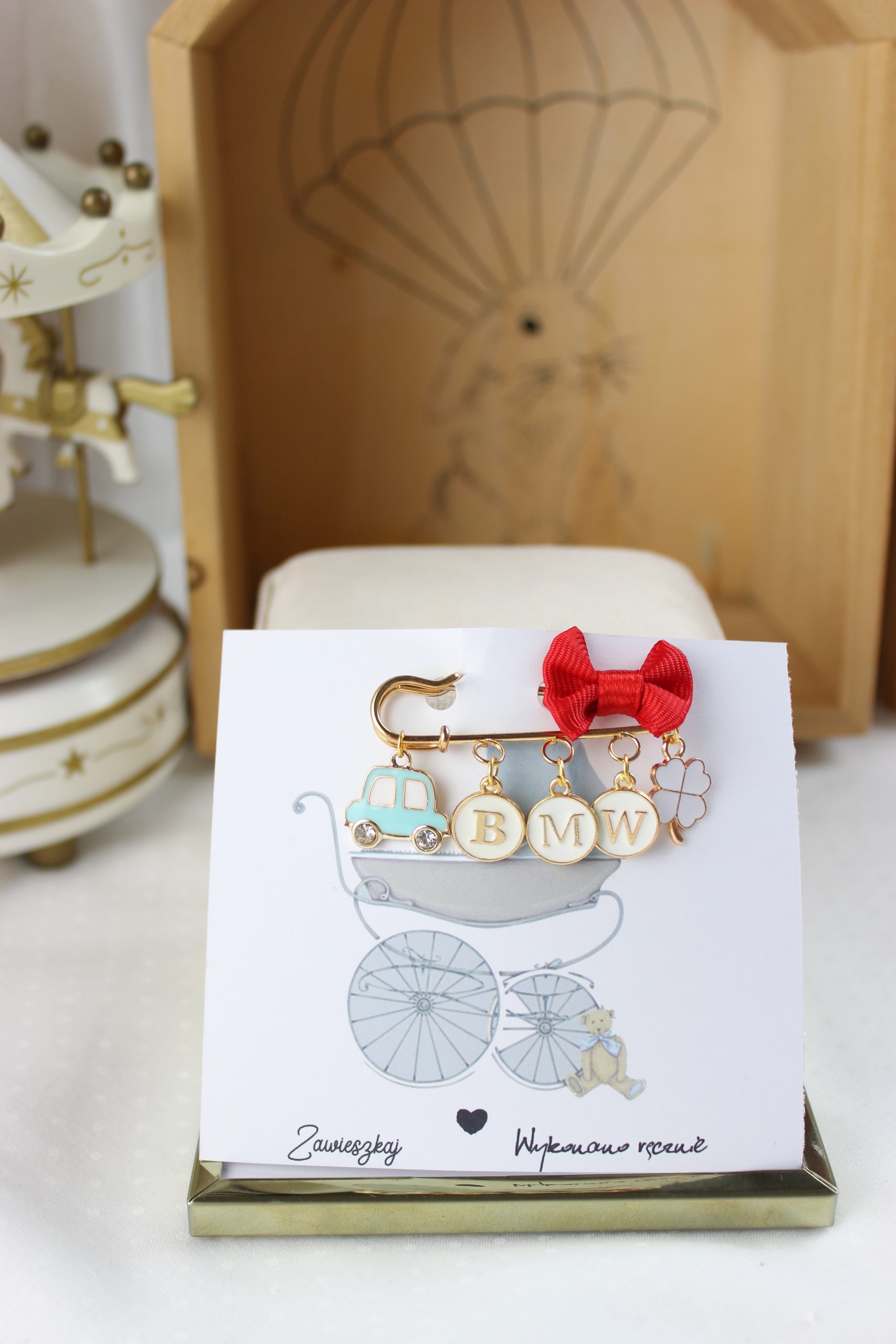 Agrafka w kolorze złotym to idealny prezent na Baby Shower lub po prostu kiedy wybierasz się w odwiedziny do nowonarodzonego dzieciątka.