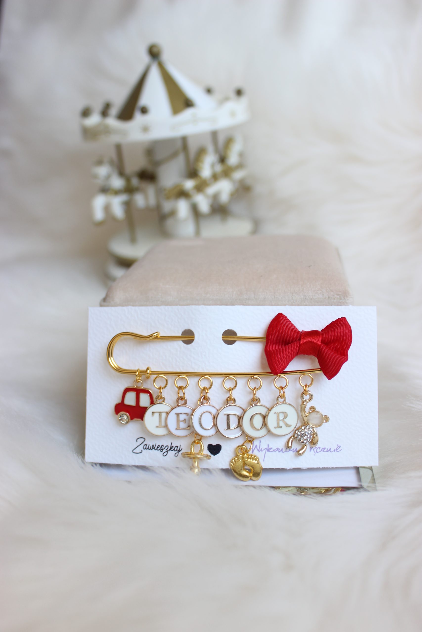 Tutaj zamawiasz produkt z dodatkami widocznymi na zdjęciu-Czerwone autko, miś, smoczek,stopki oraz imię składające się z 6 liter!