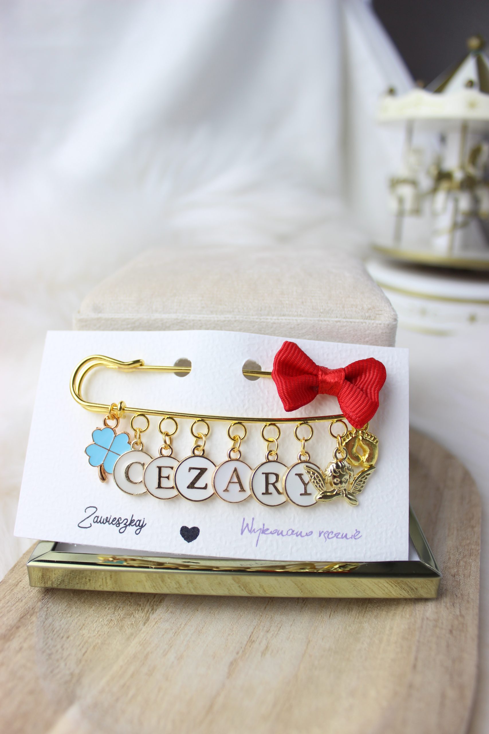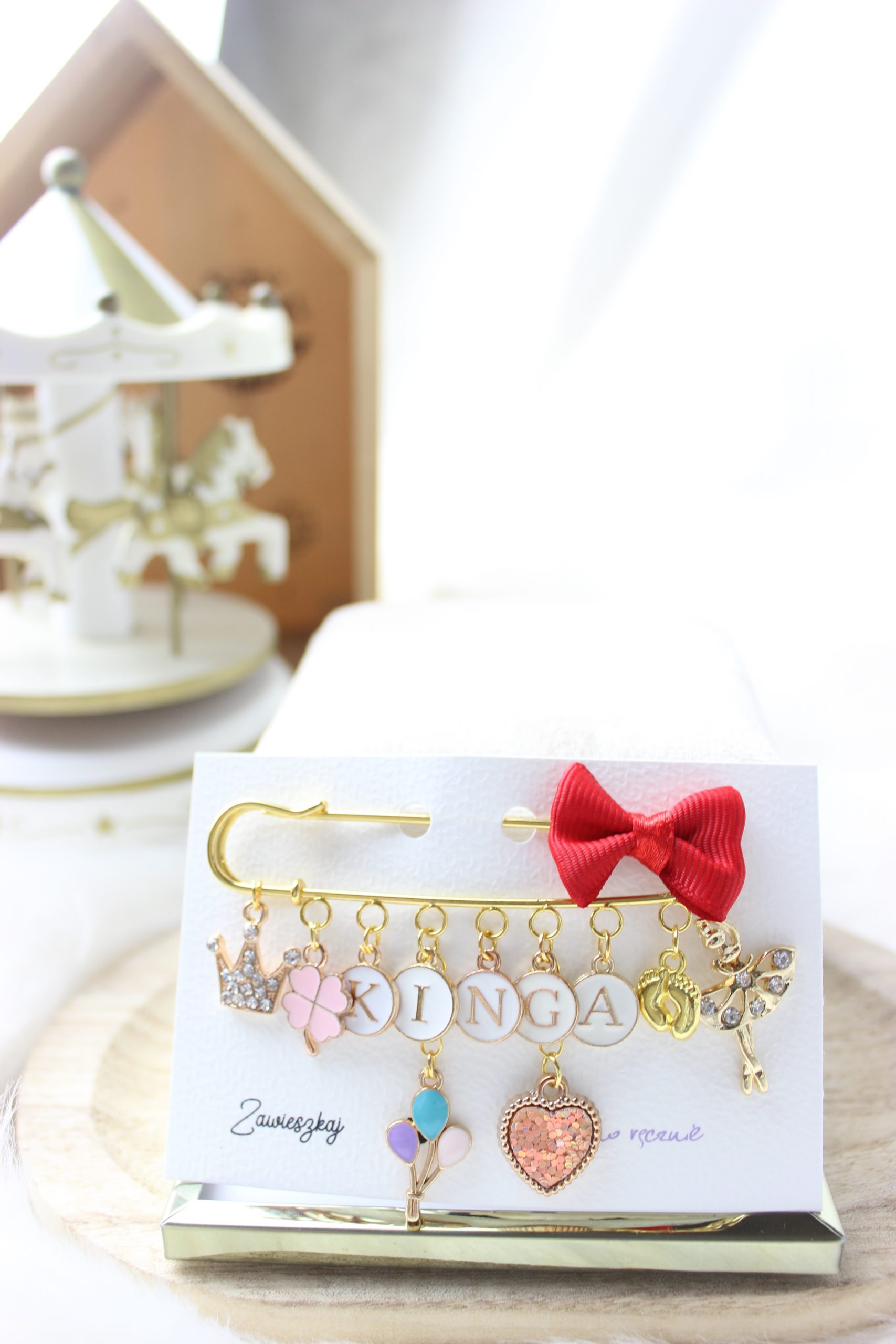 Agrafka w kolorze złotym to idealny prezent na Baby Shower lub po prostu kiedy wybierasz się w odwiedziny do nowonarodzonego dzieciątka.