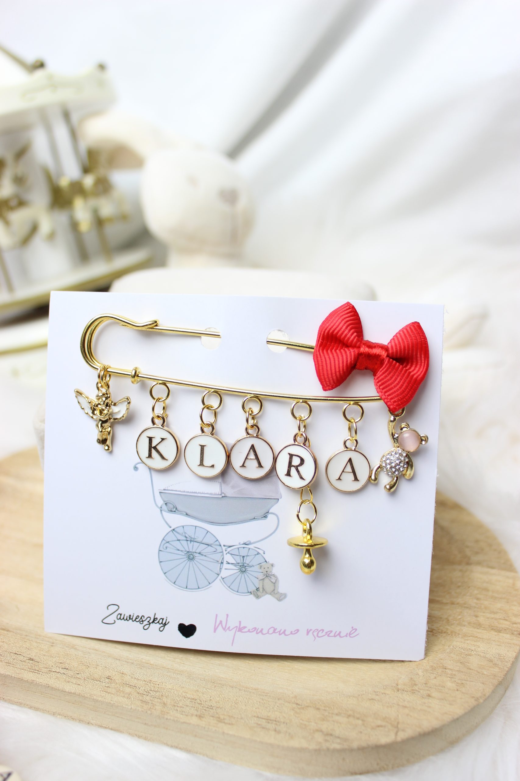 W oryginalnych literkach od producenta nie ma polskich znaków, jeśli zamówisz agrafkę z literkami ; Ł, Ń,Ś – dopisujemy je niezmywalnym złotym markerem.