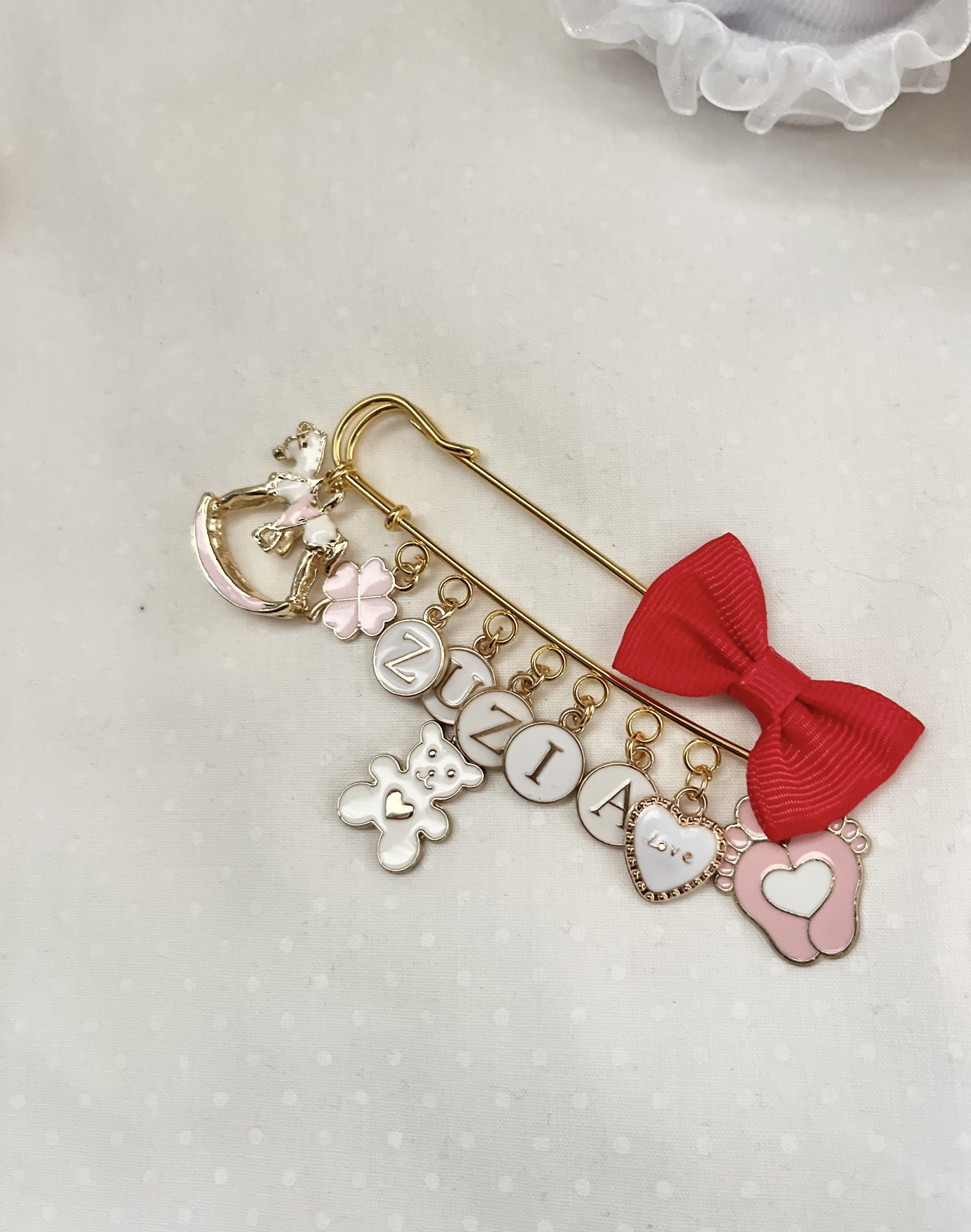 Agrafka w kolorze złotym to idealny prezent na Baby Shower lub po prostu kiedy wybierasz się w odwiedziny do nowonarodzonego dzieciątka.