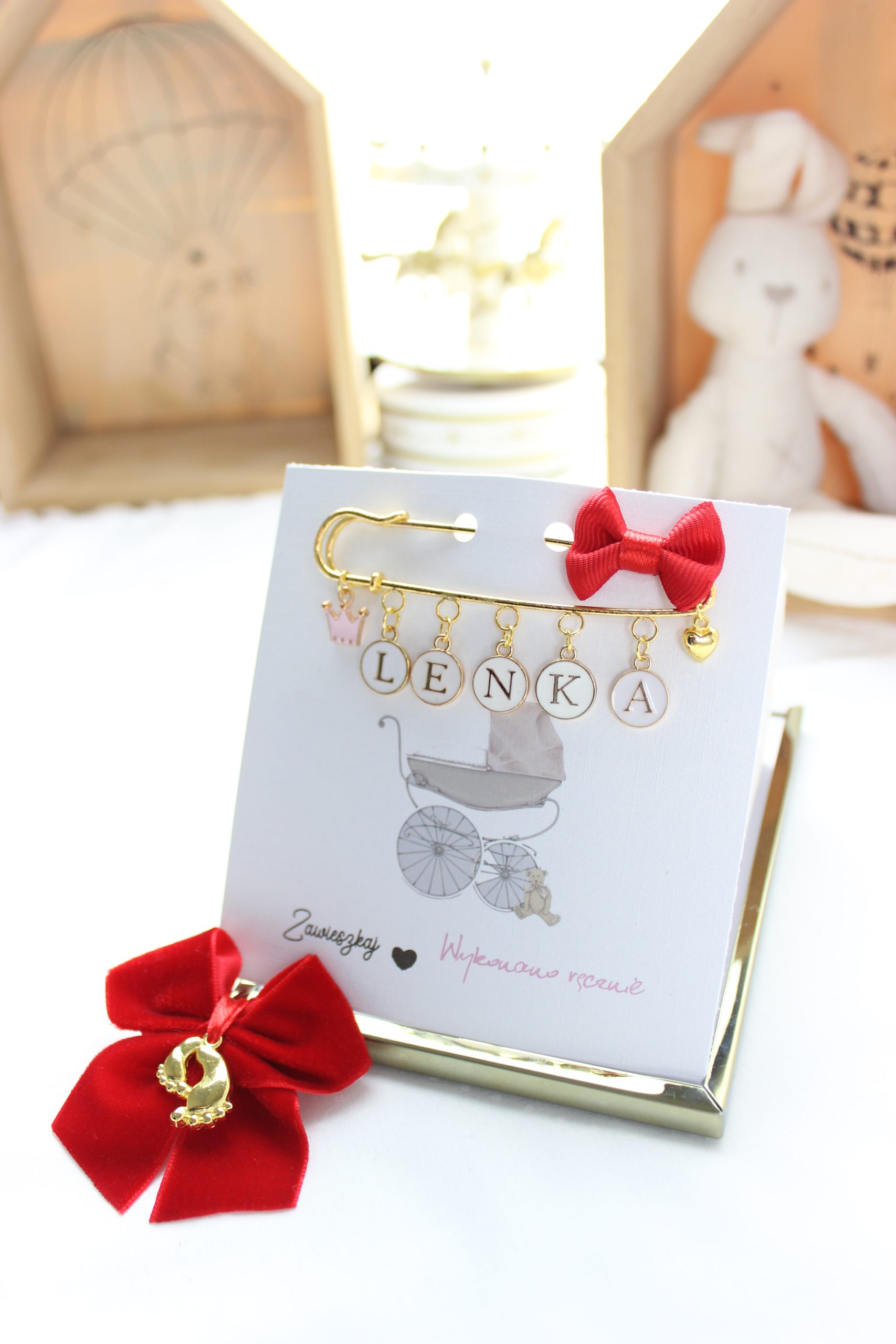 Agrafka w kolorze złotym to idealny prezent na Baby Shower lub po prostu kiedy wybierasz się w odwiedziny do nowonarodzonego dzieciątka.