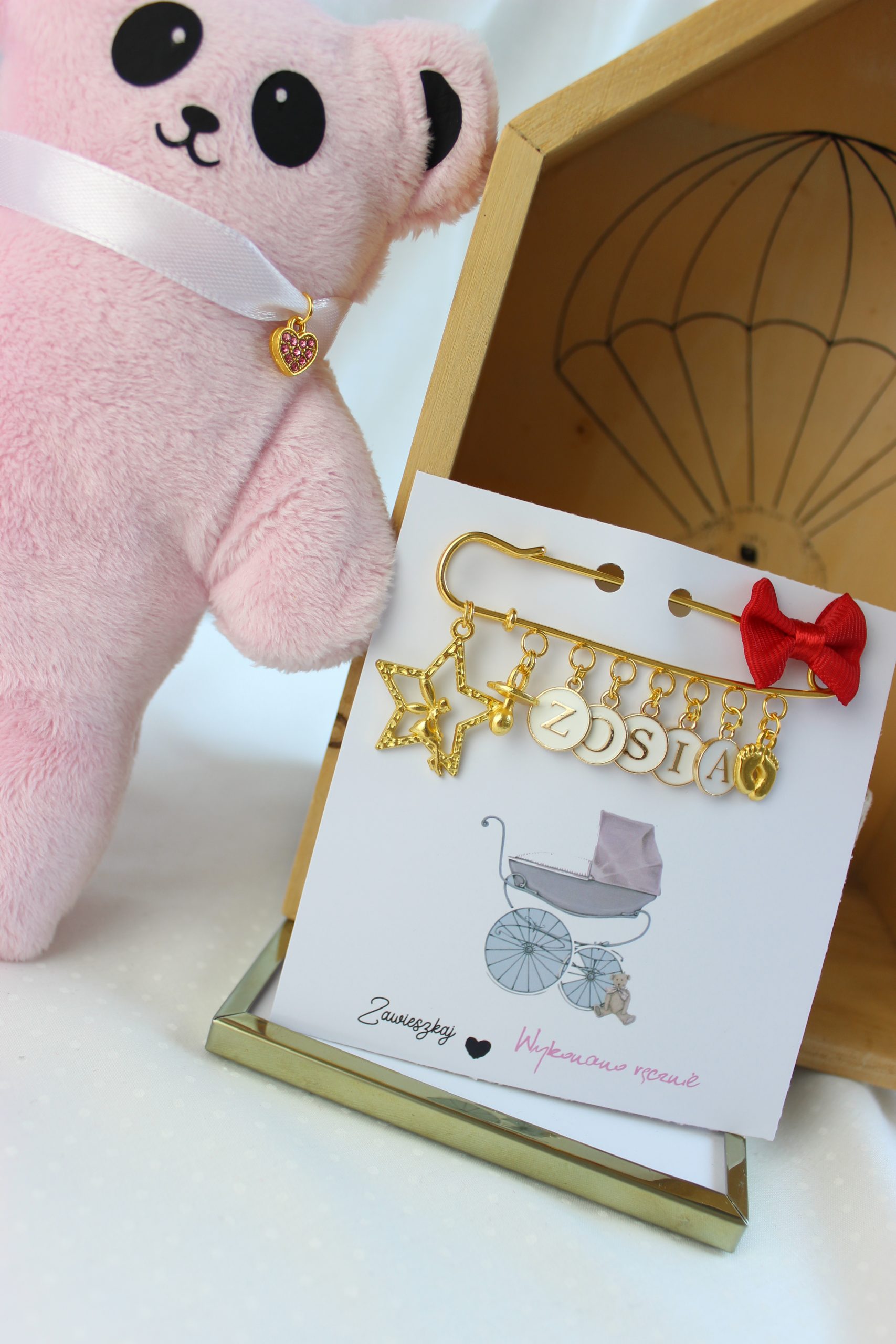 Agrafka w kolorze złotym to idealny prezent na Baby Shower lub po prostu kiedy wybierasz się w odwiedziny do nowonarodzonego dzieciątka.