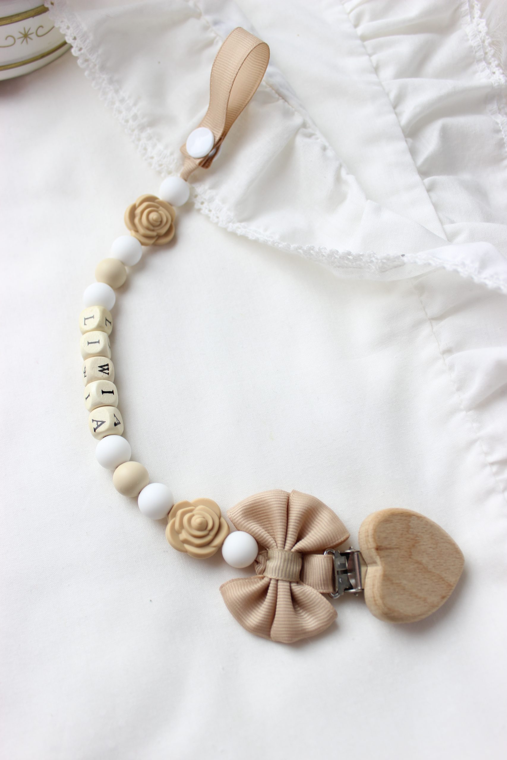 Tutaj zamawiasz produkt z dodatkami widocznymi na zdjęciu-Baletki, okrągłe love, biała kokardka, baletnica, biała koniczynka, łapacz snów z cyrkonią oraz imię składające się z 4 liter!