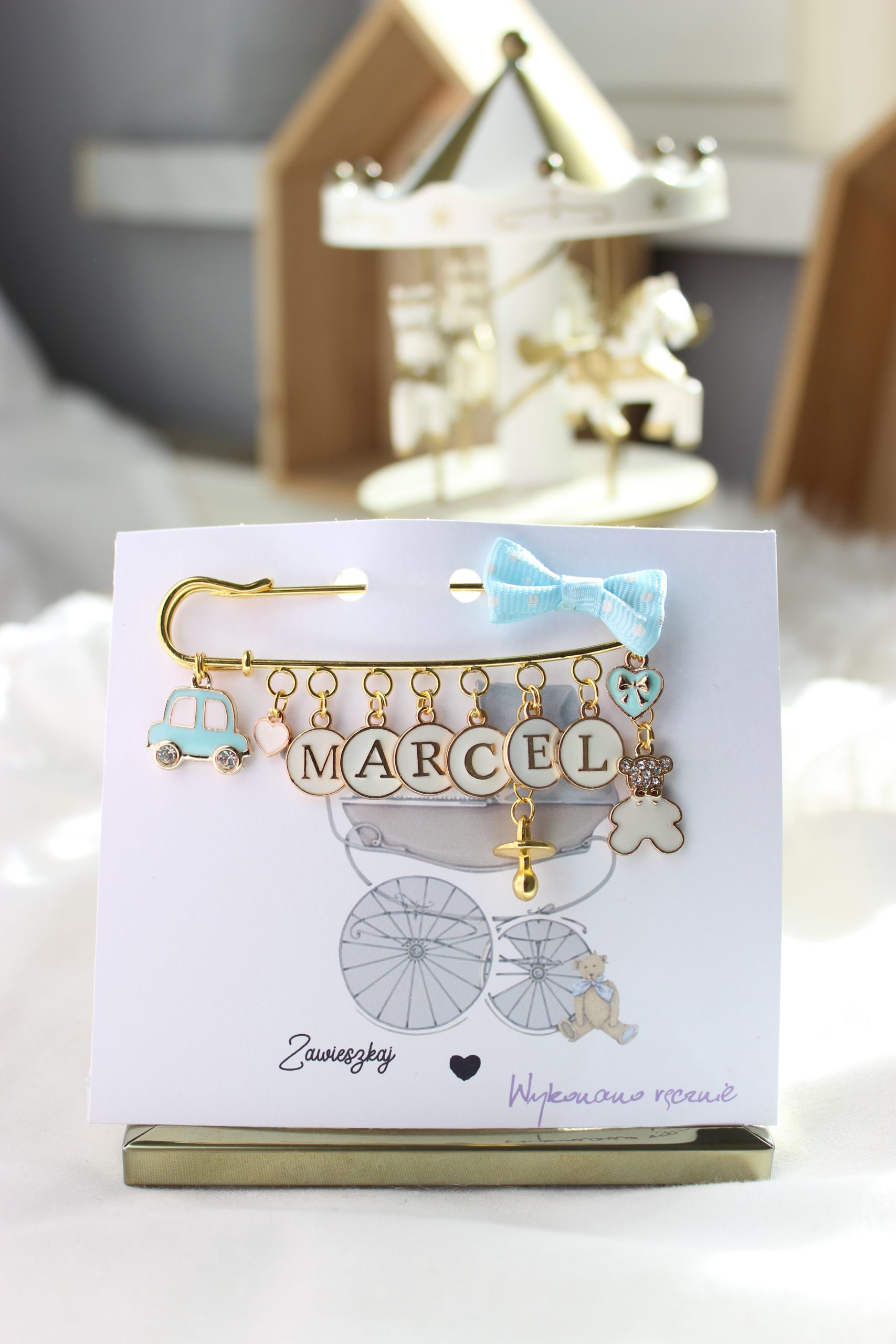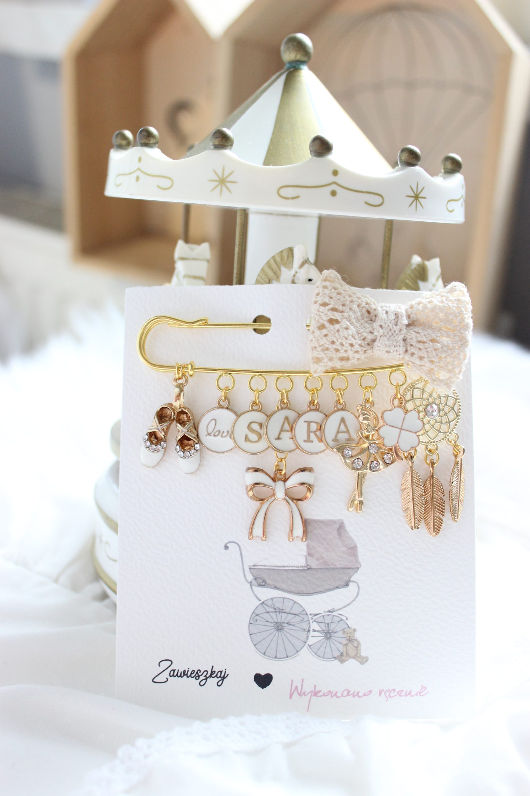 Agrafka w kolorze złotym to idealny prezent na Baby Shower lub po prostu kiedy wybierasz się w odwiedziny do nowonarodzonego dzieciątka.