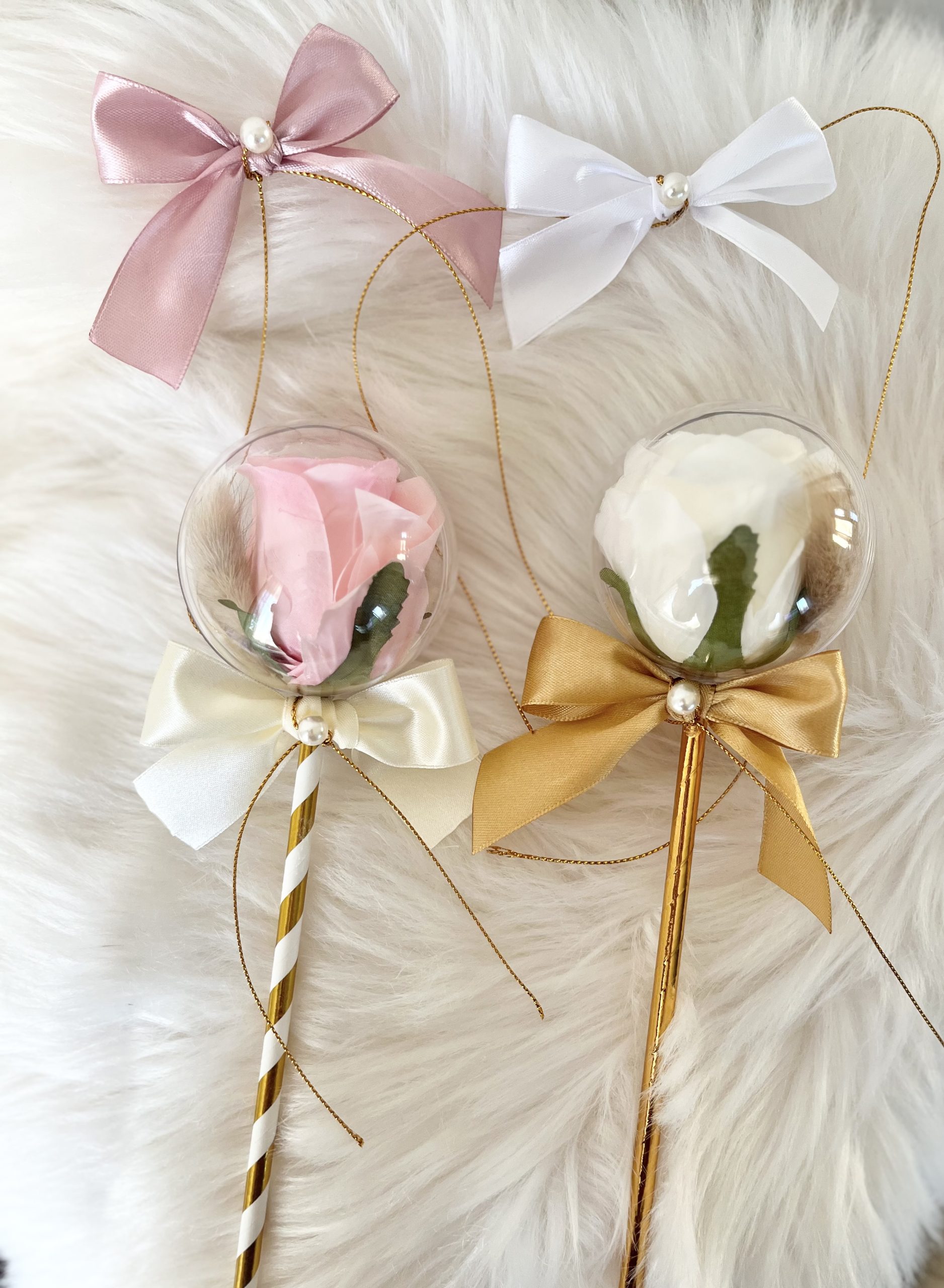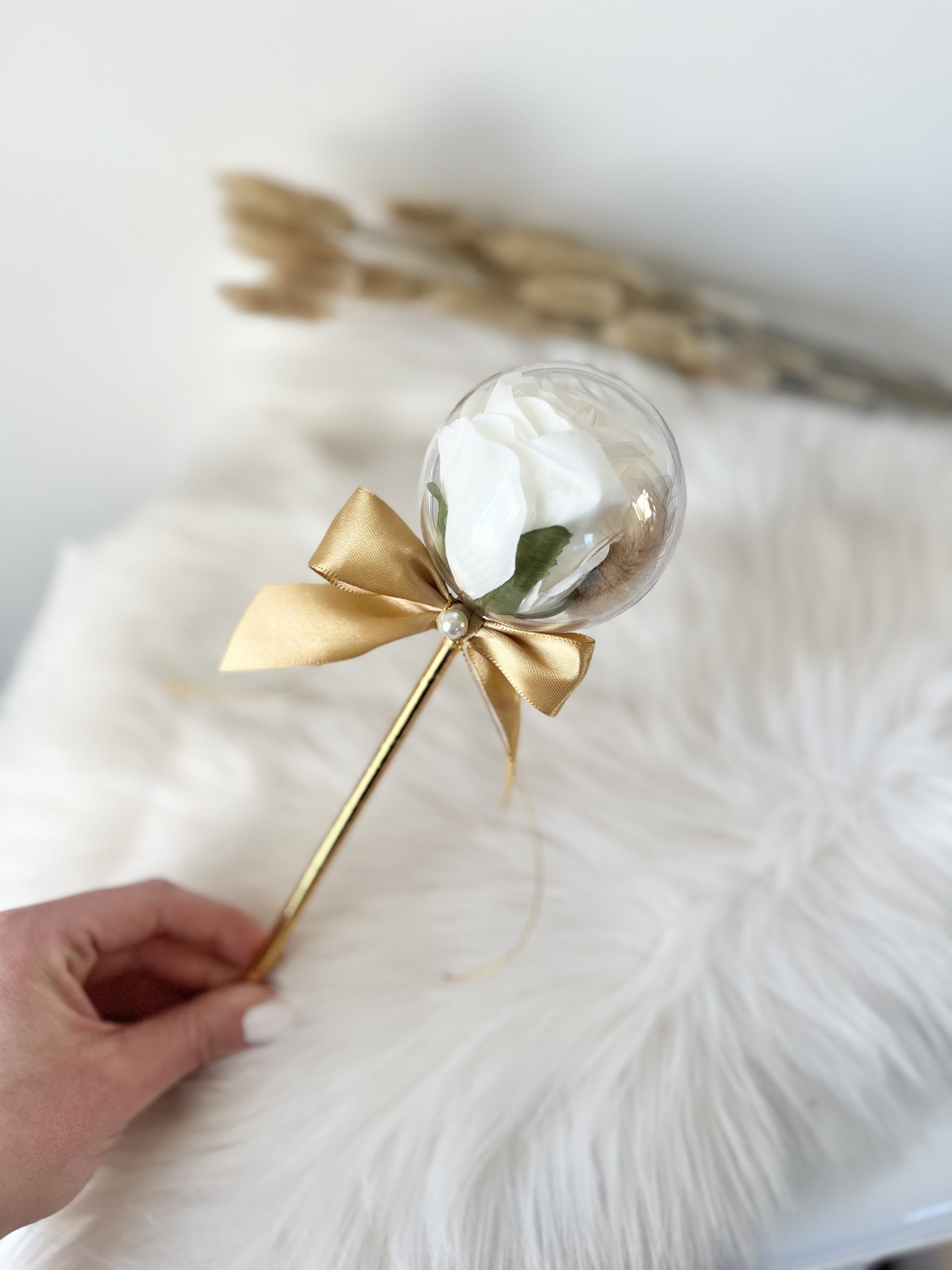 W środku kuli znajduje się sztuczna róża i suszki.