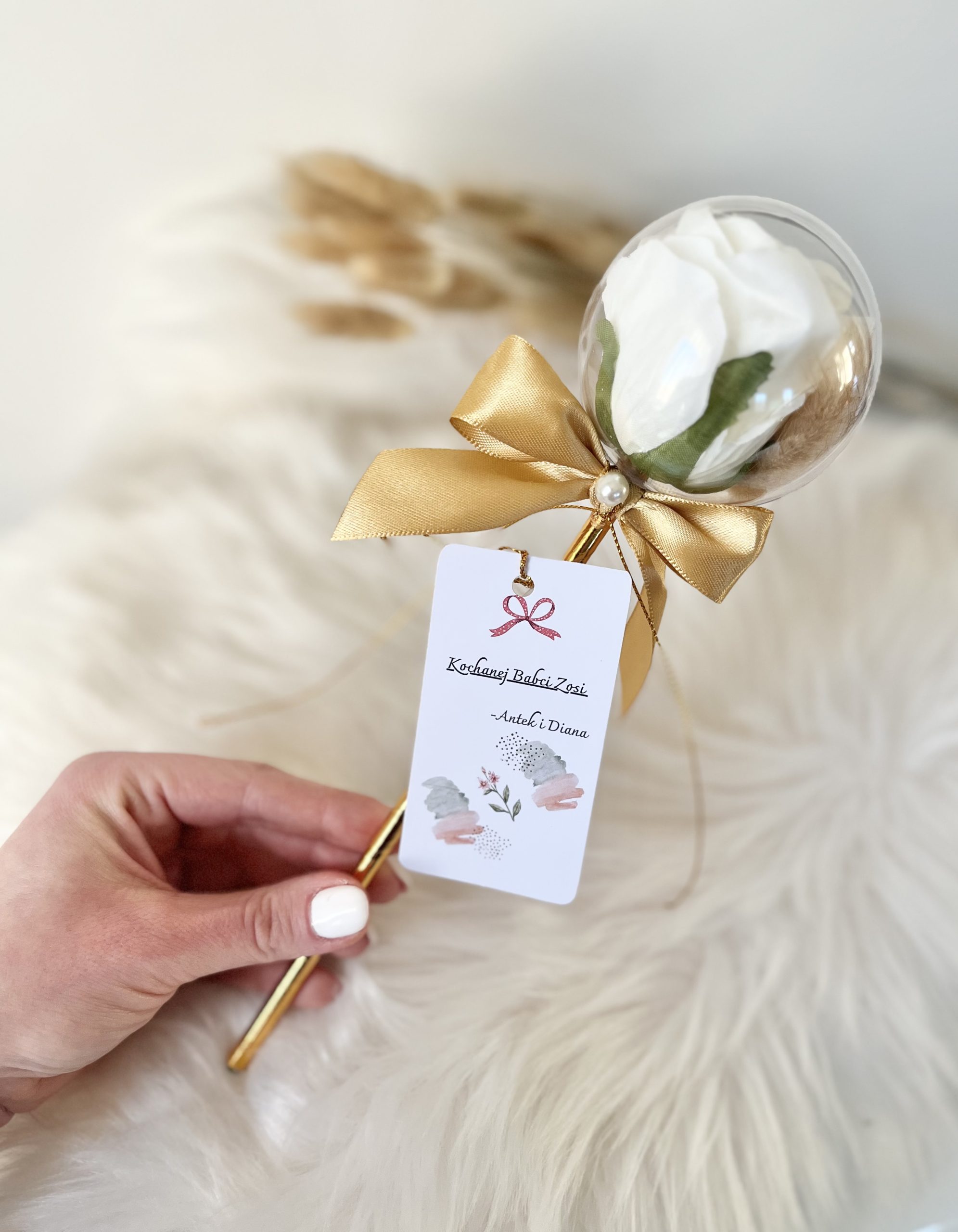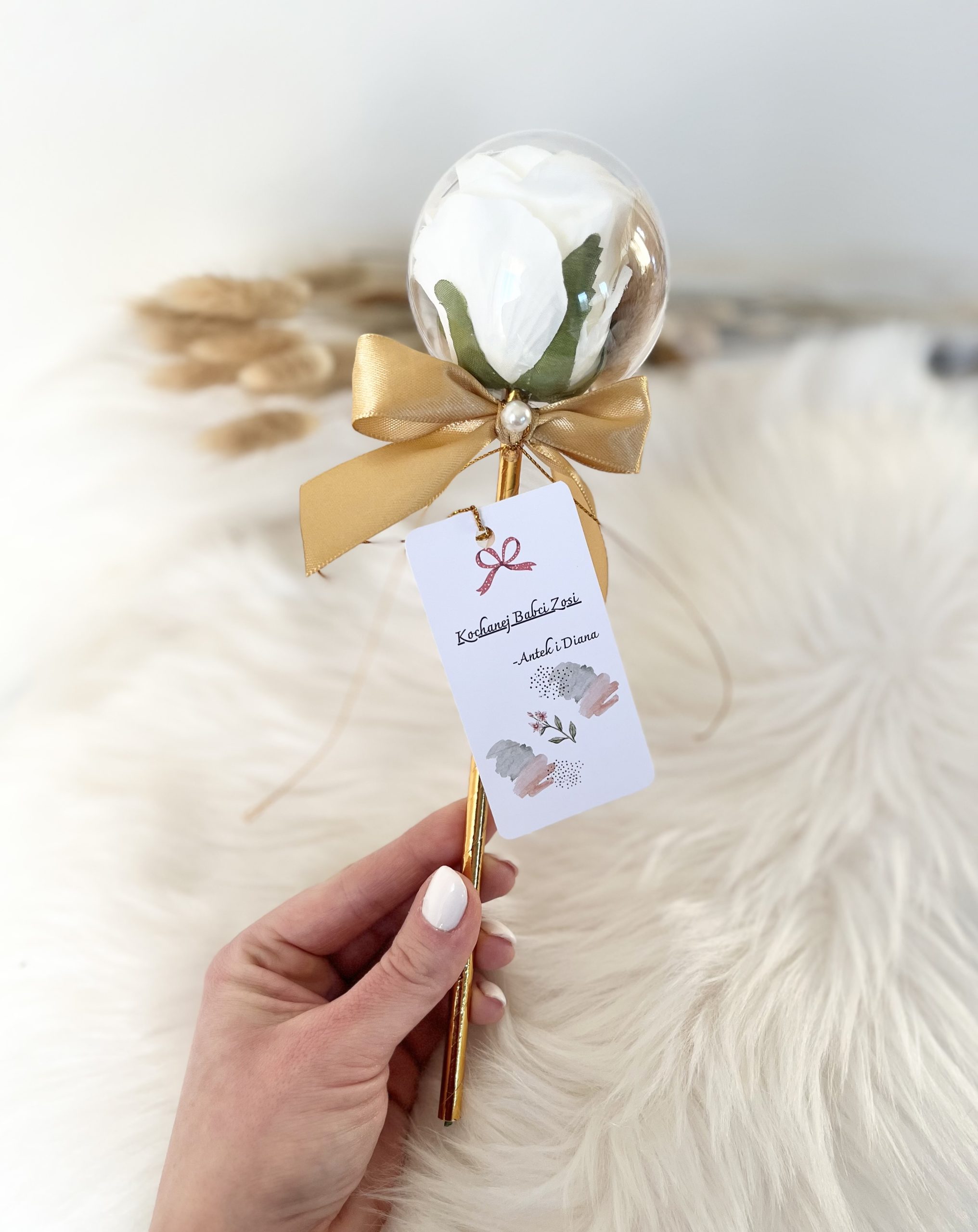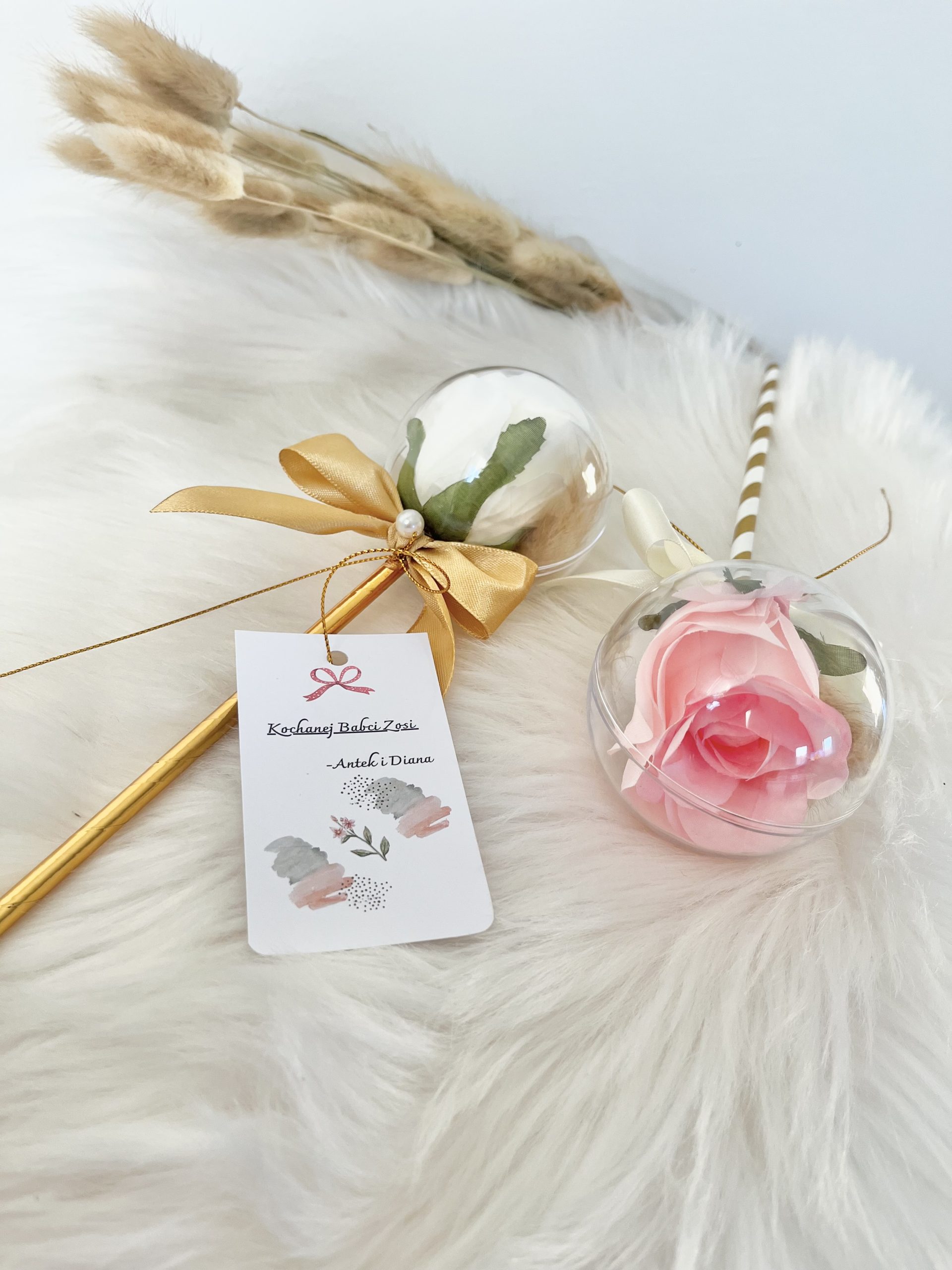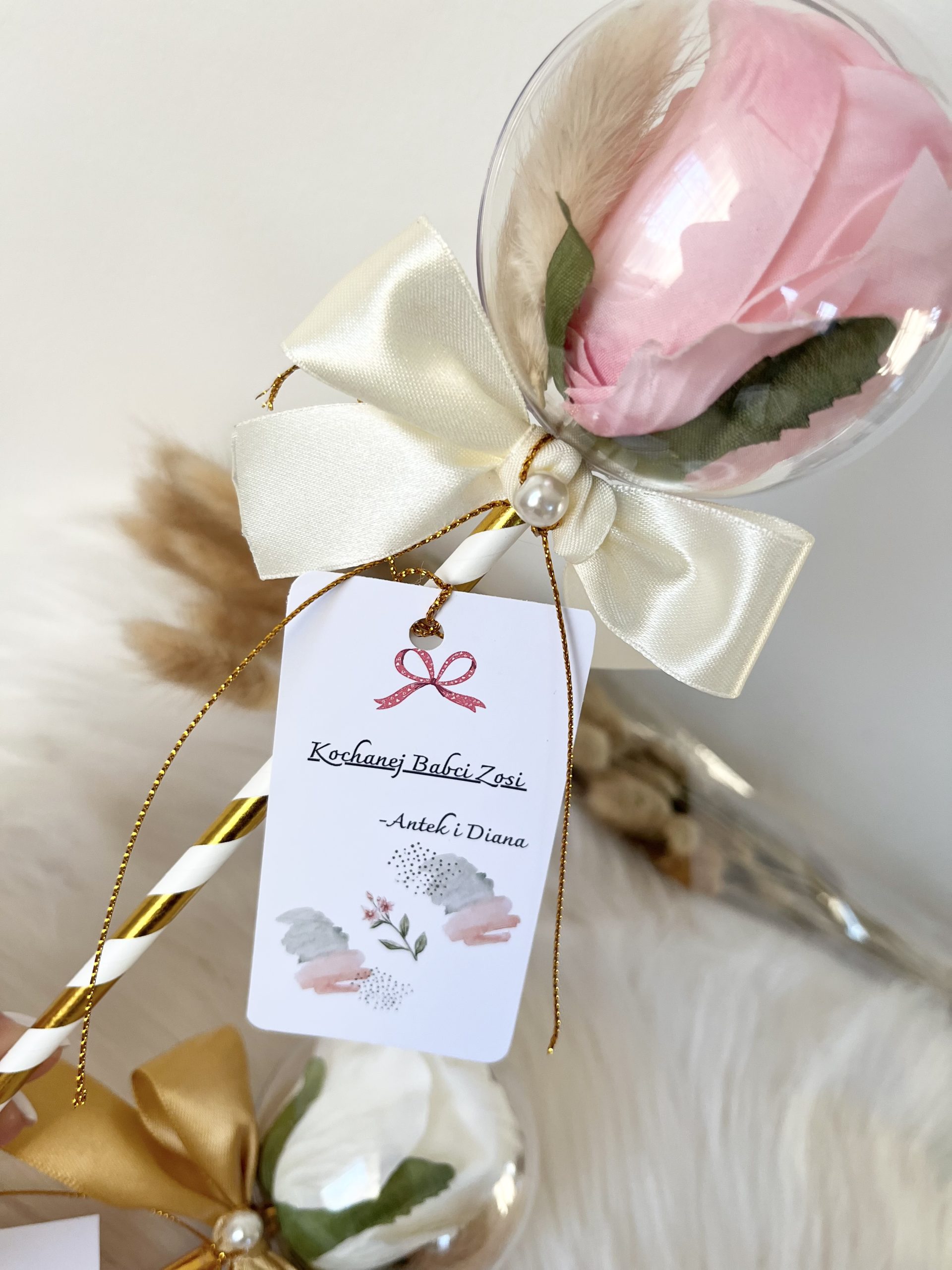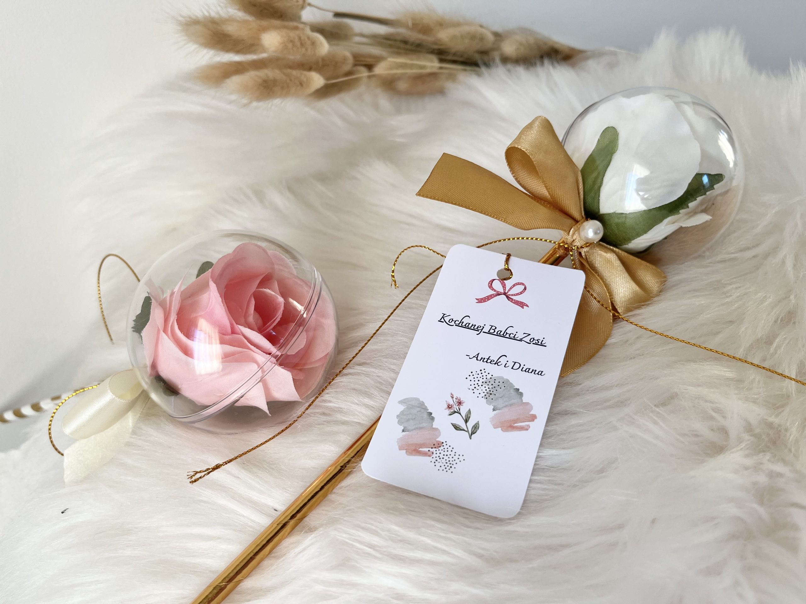 *** Dla Dziadka możemy wykonać kulę z białą różą w środku i białą lub złotą kokardką. Życzenia również dopasujemy dla Dziadka. 🙂