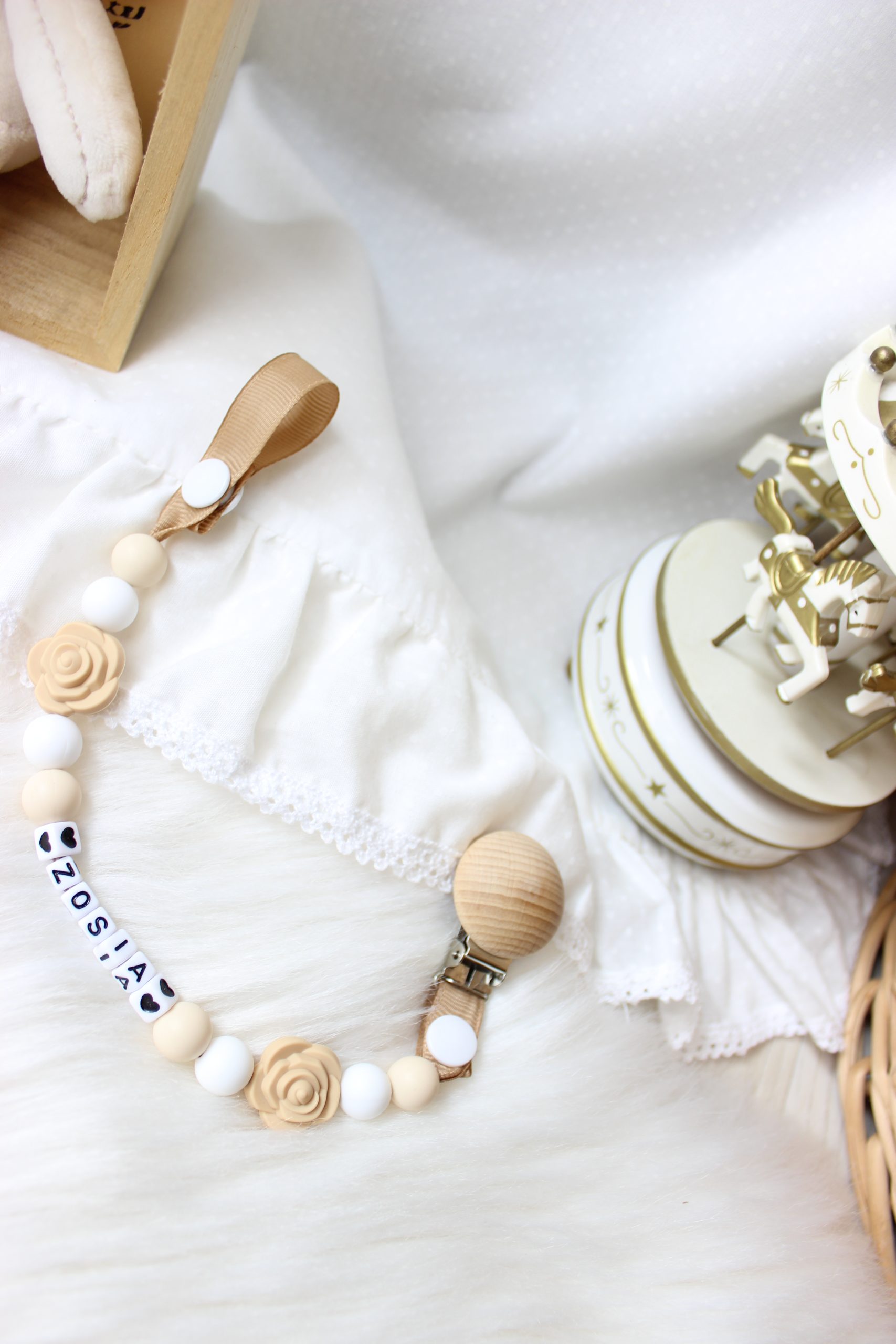 Zawieszka do smoczka 'biała kokardka i drewno’