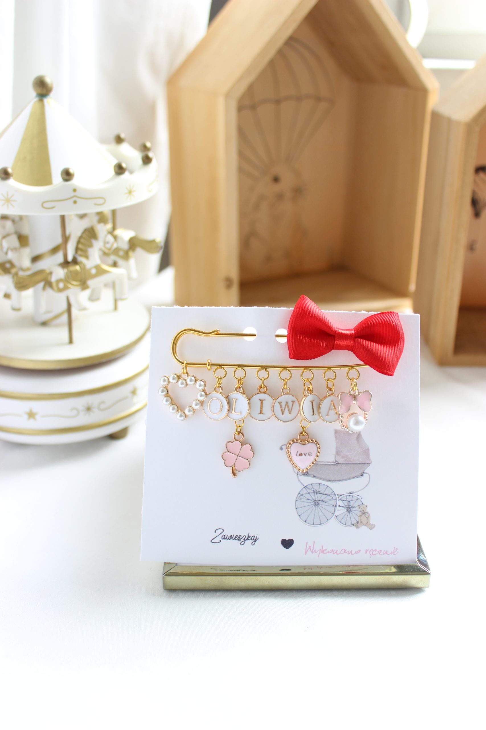 W cenie zawieszki są 2 dodatkowe ozdobne elementy, typu – korona, kwiatek, serce, autko, jednorożec itd.