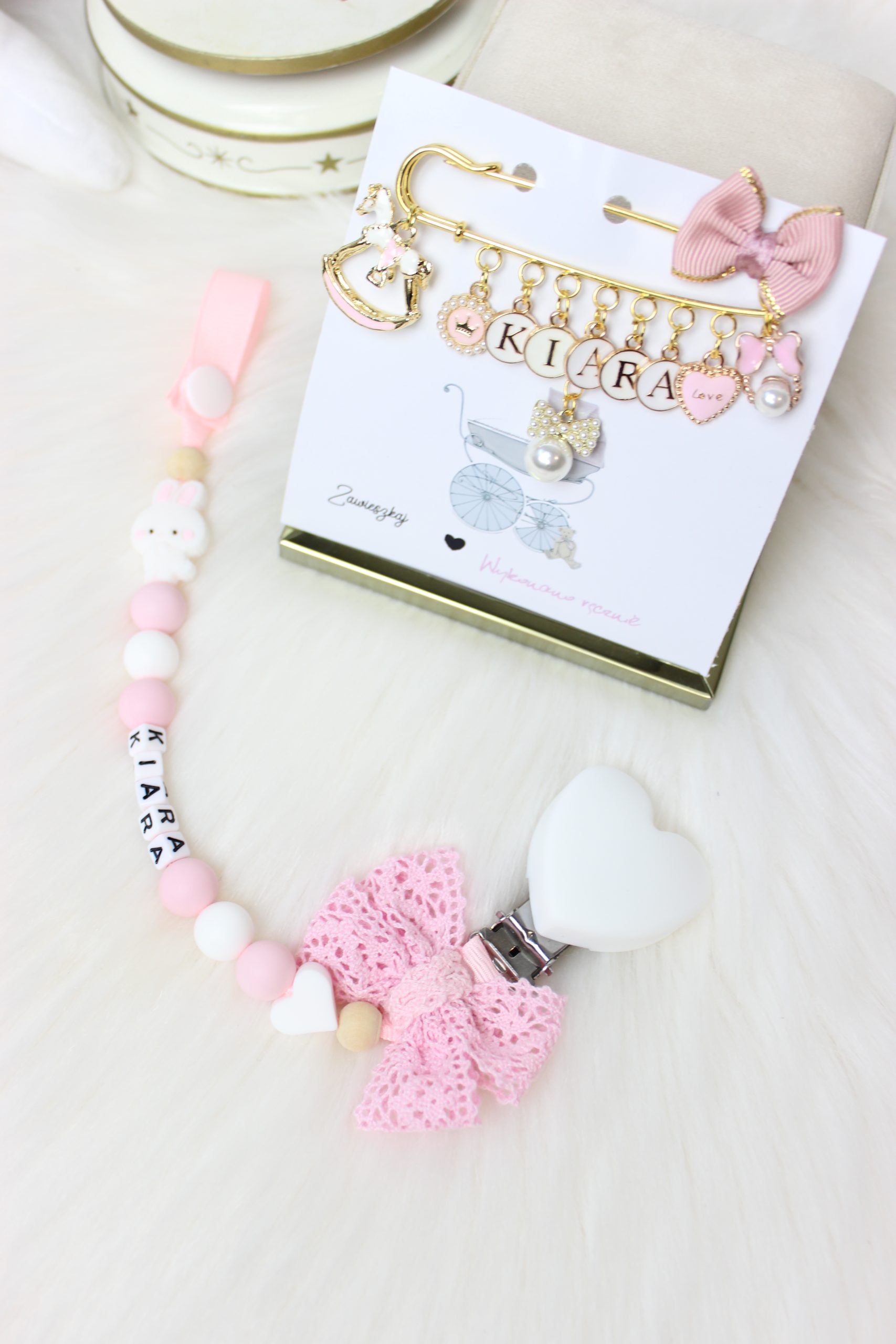 Cena dotyczy zawieszki do smoczka na tasiemce z klipsem silikonowym i kokardki ażurowej.