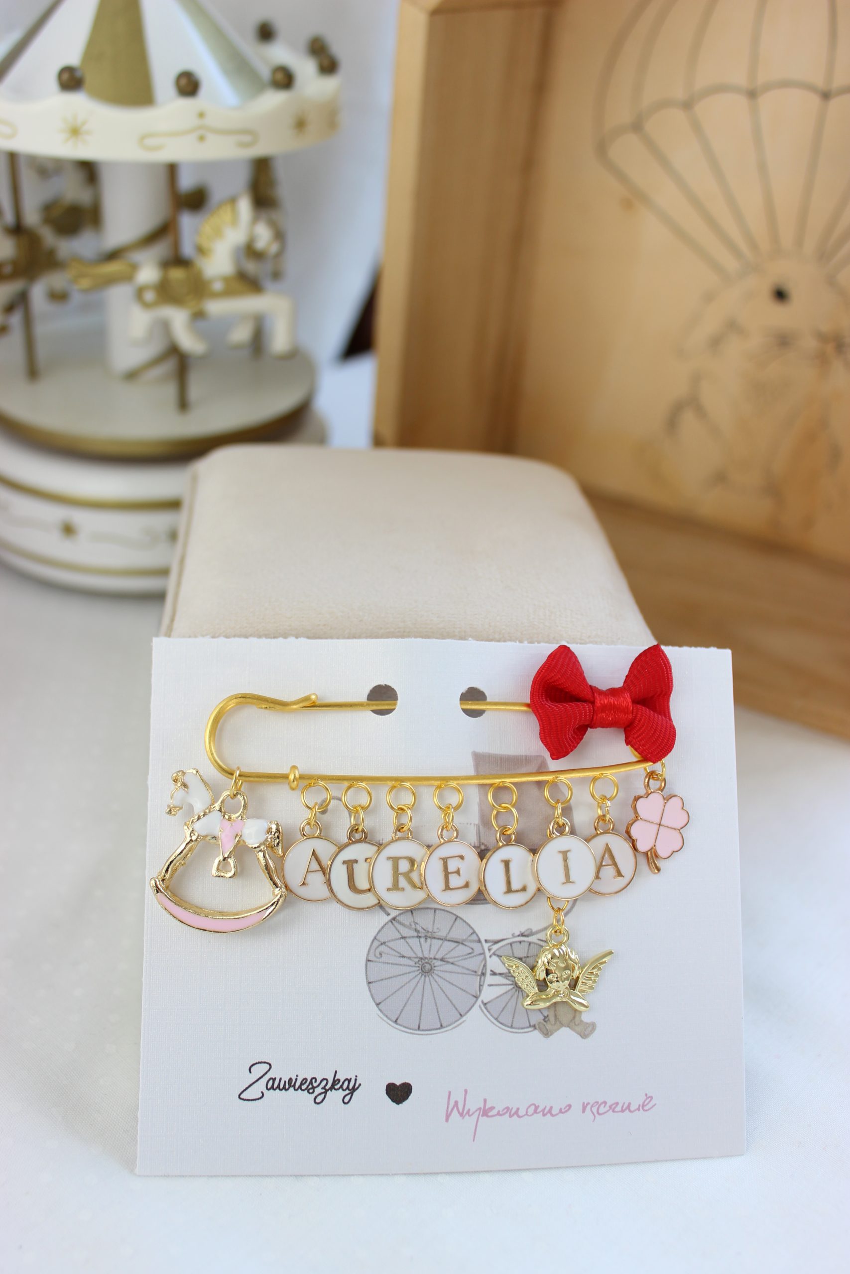 Zależy Nam, by zawieszka była bezpieczna więc musi posiadać określoną długość- jest to około 25 – max 30 cm, dlatego jeśli imię jest dłuższe, damy mniej kulek.